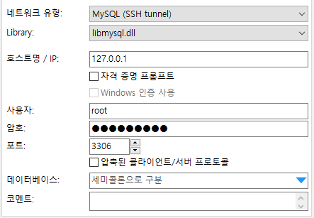 로컬포트: 사용하지 않는 포트가 아닌 것 아무거나(3306은 사용 중이므로)